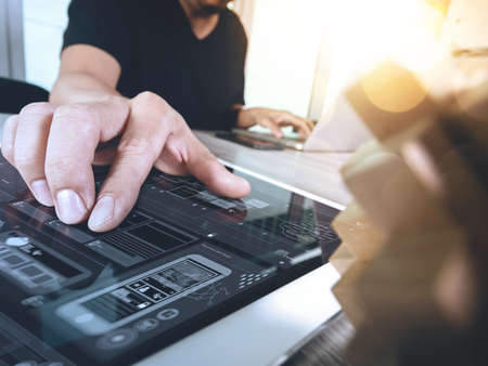 Photo website graphic designer hand meeting team with new project modern studio.Modern laptop digital tablet smart phone on marble table.pan-tone colors documents, sun flare effect