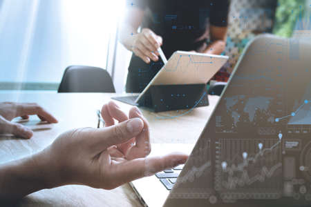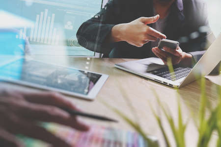 Business team meeting present. Photo professional investor working with new startup project. Finance managers meeting.Digital tablet laptop computer design smart phone using.Sun flare effect