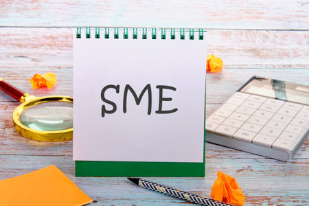 SME abbreviation of Small and Medium Enterprises. Copy space. Text SME on a blank sheet of notepad next to a calculator, stickers, a magnifying glass on old boards