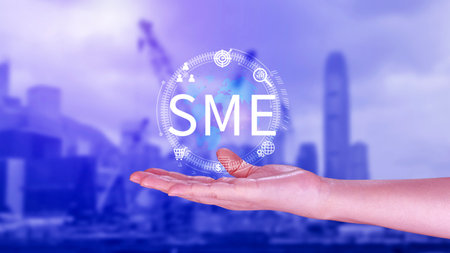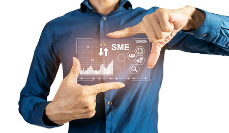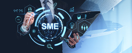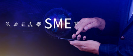 SME Business Growth and Development Concept. Businessman points to an icon SME with various business-related icons, symbolizing growth, strategy, and success of small and medium-sized enterprises.