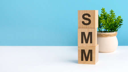 smm - word from wooden blocks with letters. business concept on blue background. copy space available