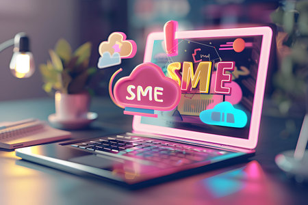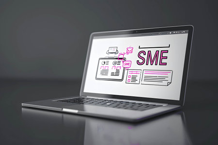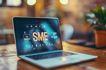 Laptop displaying a business plan document with the word “SME†prominently featured, Small and Medium Enterprises concept