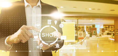 Co worker Designer hand using mobile payments online shopping,omni channel,in modern office wooden desk,icons graphic interface screen,eyeglass,filter