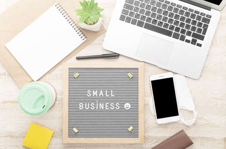 top view of a flat lay with a sign with the inscription, coffee, laptop, mobile, notepad and other stationery on a light wooden table, small business, freelance concept