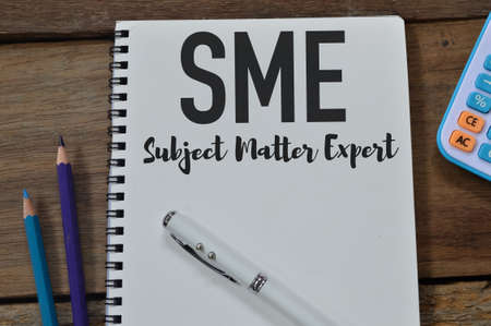 Top view of pencil colors, pen and notebook written with text SME stands for Subject Matter Expert