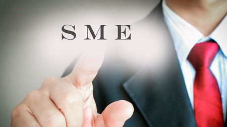 Businessman in suit showing gesture pointing at text SME , Business concept.