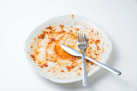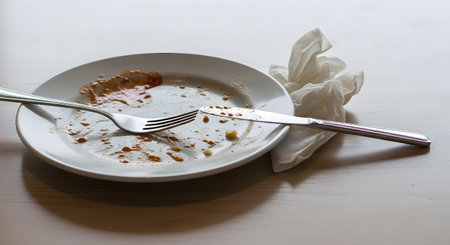 A dirty white dinner plate sits on a table with food residue, sauce smears, and crumbs after a meal. A used fork and knife rest on the plate alongside a crumpled white napkin, representing the end of dining.