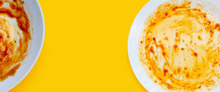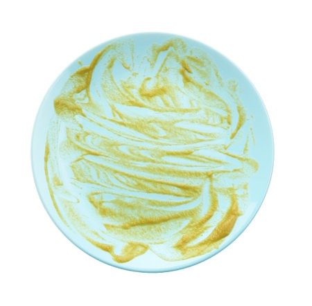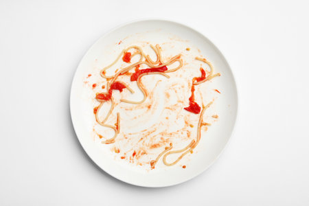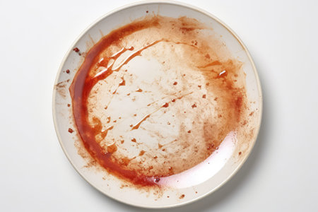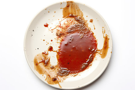 Dirty Plate Isolated, Empty Bowl after Dinner, Finished Lunch, Oil and Smeared Sauce on White Plate Background Top View, Generative AI Illustration