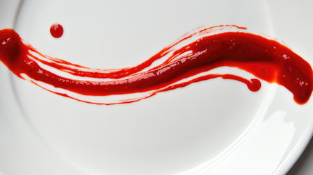 A creative depiction of red sauce artistically arranged on a white plate, forming a playful smile shape that adds visual intrigue to dining experiences.