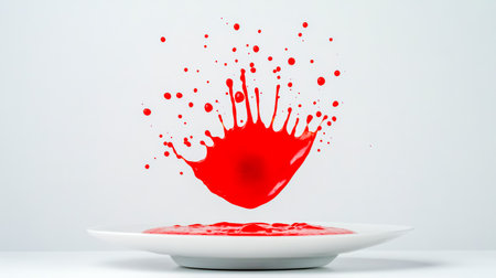 Vibrant red sauce splashing dramatically over a white plate, creating an eye catching display against a clean white backdrop, perfect for food photography or advertising