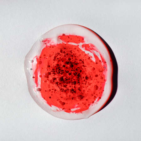 Red and white transparent gel drop isolated on white background. Top view. Virus protection or cosmetics concept. Serum texture close up.