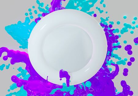Round circle prepared for text with abstract colorful splash in blue and violet color. 3D illustration