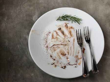 finished brownie cake with dark chocolate stained, two silver forks and fresh rosemary on white ceremic plate is putted on stylish grey table with copy space on left side of frame