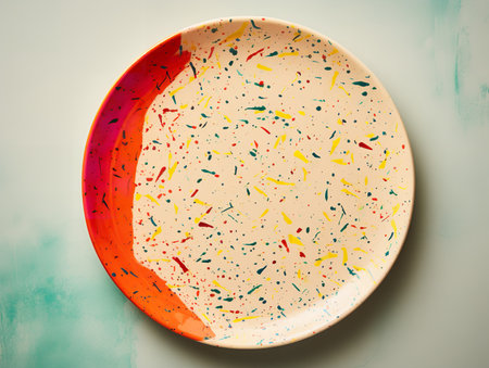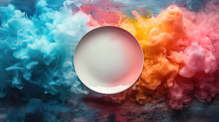 Black plate on a vibrant blue and green abstract painting background in a creative setting