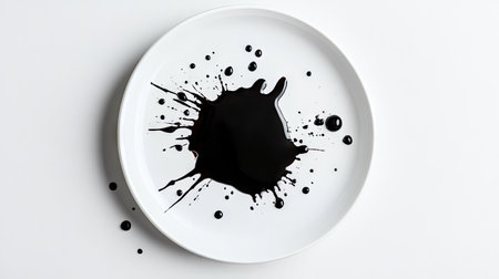 A burst of chocolate splatters contrasts beautifully against a clean white plate, showcasing an artistic flair.
