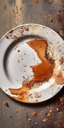 Dirty White Plate With Brown Spots. The dirty white plate is covered in brown spots, indicating dried food residue. On PNG Transparent Clear Background..
