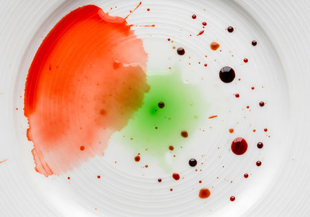Abstract composition of red and green liquid splatters and drops on a white plate, creating a vibrant and artistic pattern with a clean, minimalist aesthetic.