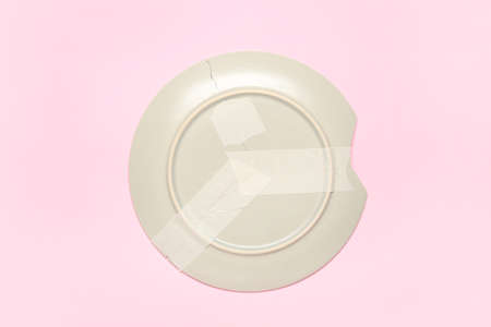 Conceptual image of the end of the holiday. Empty round plate with crumbs on yellow background.