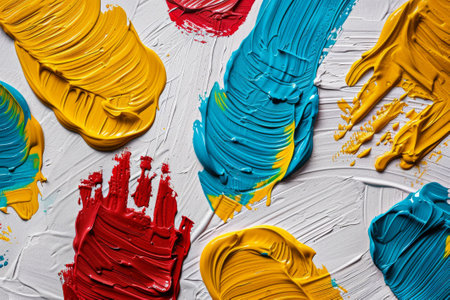 Vibrant brush strokes of blue, red, and yellow paint create a dynamic composition on a textured canvas, showcasing artistic creativity and expression.
