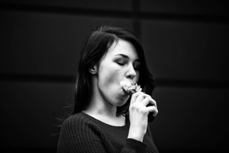 Vaping teenager with problem skin. Young pretty caucasian girl in a jacket smoking electronic cigarette opposite modern brown background on the street in the evening. Deadly bad habit. Black and white