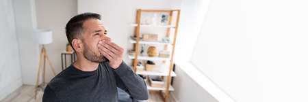 Allergy to dust. A man sneezes because he is allergic to dust. Dust flies in the air backlit by light.