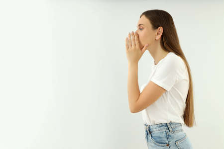 Concept of people, young woman on light background