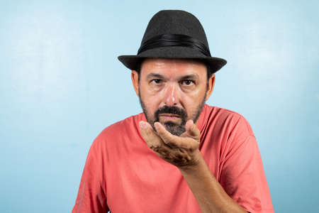 Portrait of mature man standing on blue background.