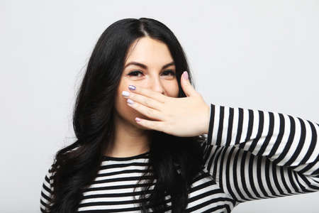 Body language, emotions, and people concept: Young brunette female in a striped sweater smiles and is surprised, covering her mouth with her palm
