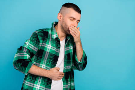 Photo of unhappy upset ill man hold hand mouth cough virus symptom isolated on pastel blue color background