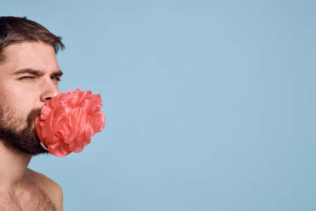 Bearded man with bare shoulders washcloth clean skin taking shower