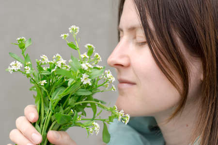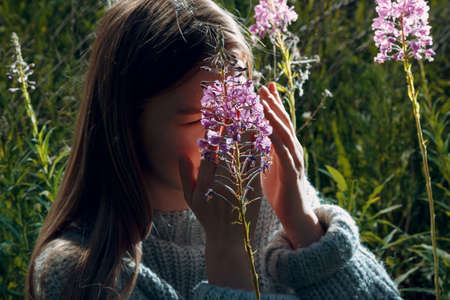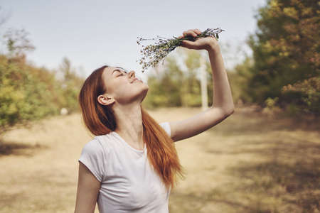 Beautiful young woman sniffing wild flowers. A bouquet of flowers in female hands. Spring and spring mood