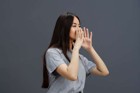 portrait woman with long hair in a gray T-shirt gesturing with hands Gray background