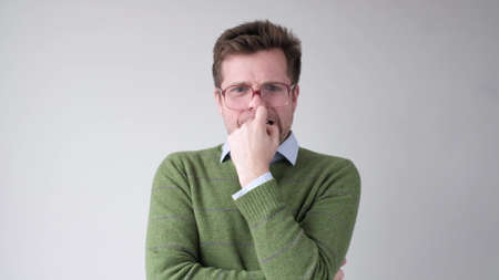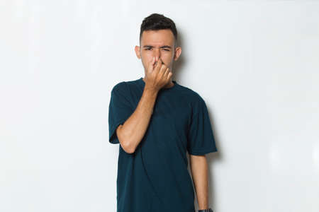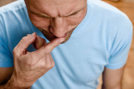 man holding his nose because of a bad smelling something