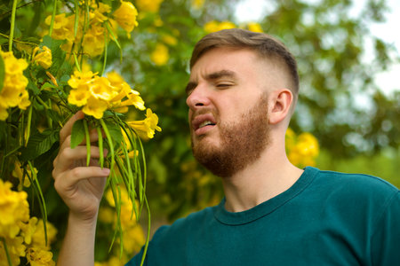 Portrait of handsome young allergic man is suffering from pollen allergy or cold on natural flowers, flowering tree background at spring or sunny summer day, sneezes, blowing his runny nose rubs eyes