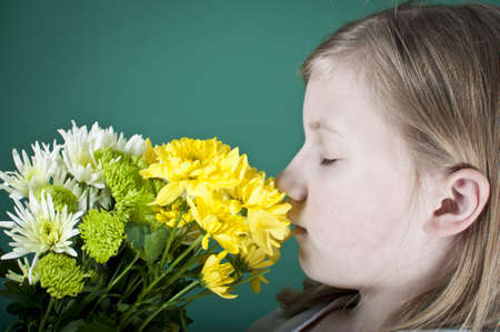 Close-up portrait of a young girl smelling mimosa flowers.