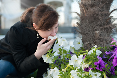 Young woman is happy to smell fragrant flowers on street window of flower shop. Work of florist. Aromatherapy. Medicinal herbs and plants.