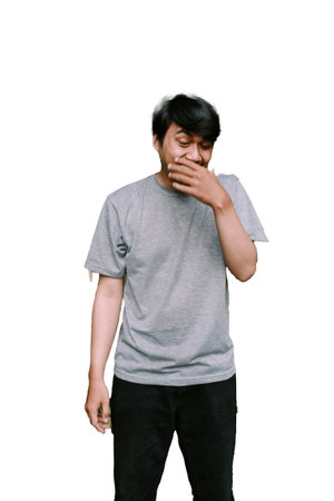 Yawning young boy - Closeup Portrait of yawning man isolated on white background with Copy Space, Student exhausted and tired for studying exam. Sleepy man yawning and closing mouth with his hand.