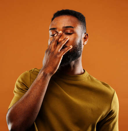 young pretty african american man posing cheerful on brown background, lifestyle people concept