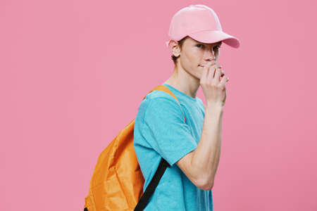 portrait of a guy in a pink t-shirt holding his hand near his face