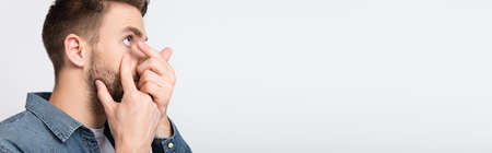 Man touching cheek while wearing contact lens isolated on gray, banner