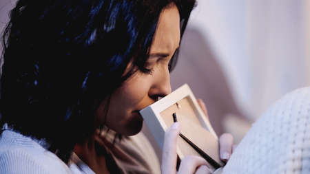 portrait of crying woman holding photo frame near mouth at home