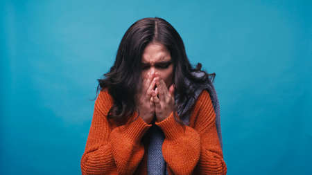 sick woman covering face with hands while sneezing with closed eyes isolated on blue
