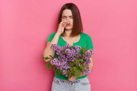 Portrait of unhappy woman wearing green T-shirt posing isolated over pink background, standing and holding bouquet of lilac flowers, touching nose, having allergy symptoms.