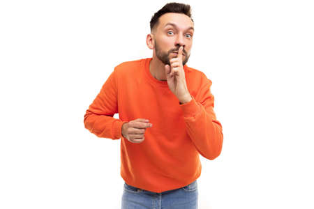 a young man demonstrates the sound of silence by gesturing with his finger to his lips. Concept classified information