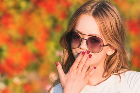 A young girl with glasses during the evening sunset.Soft sunlight