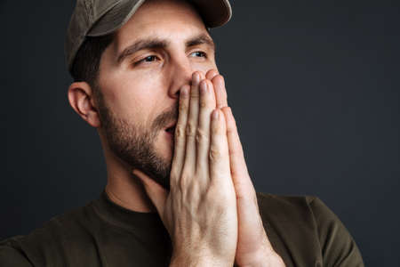 Focused masculine military man making praying gesture isolated over black background