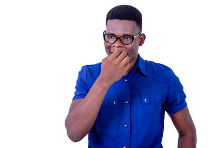Lifestyle, emotion and people concept: A young man dressed in a plaid blue shirt covers his mouth with his palms.