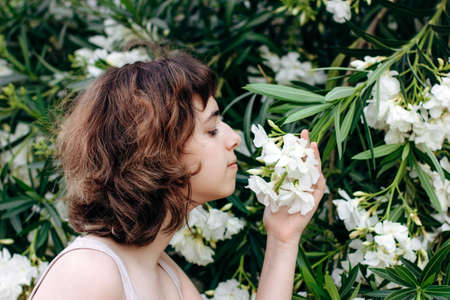 Young girl with white flowers. Perfume and organic cosmetic