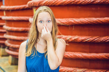 What a smell. Cheerless beautiful girl closing her nose and expressing disgust while standing isolated on grey background