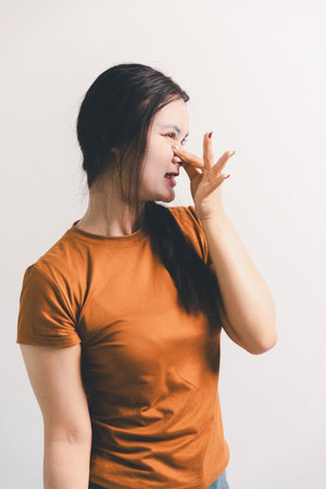 Young Asian woman holding her nose because of a bad smell on white background